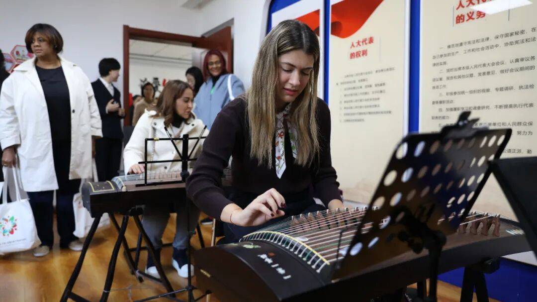 全球妇女峰会嘉宾代表参与中国传统乐器古筝公益课堂。