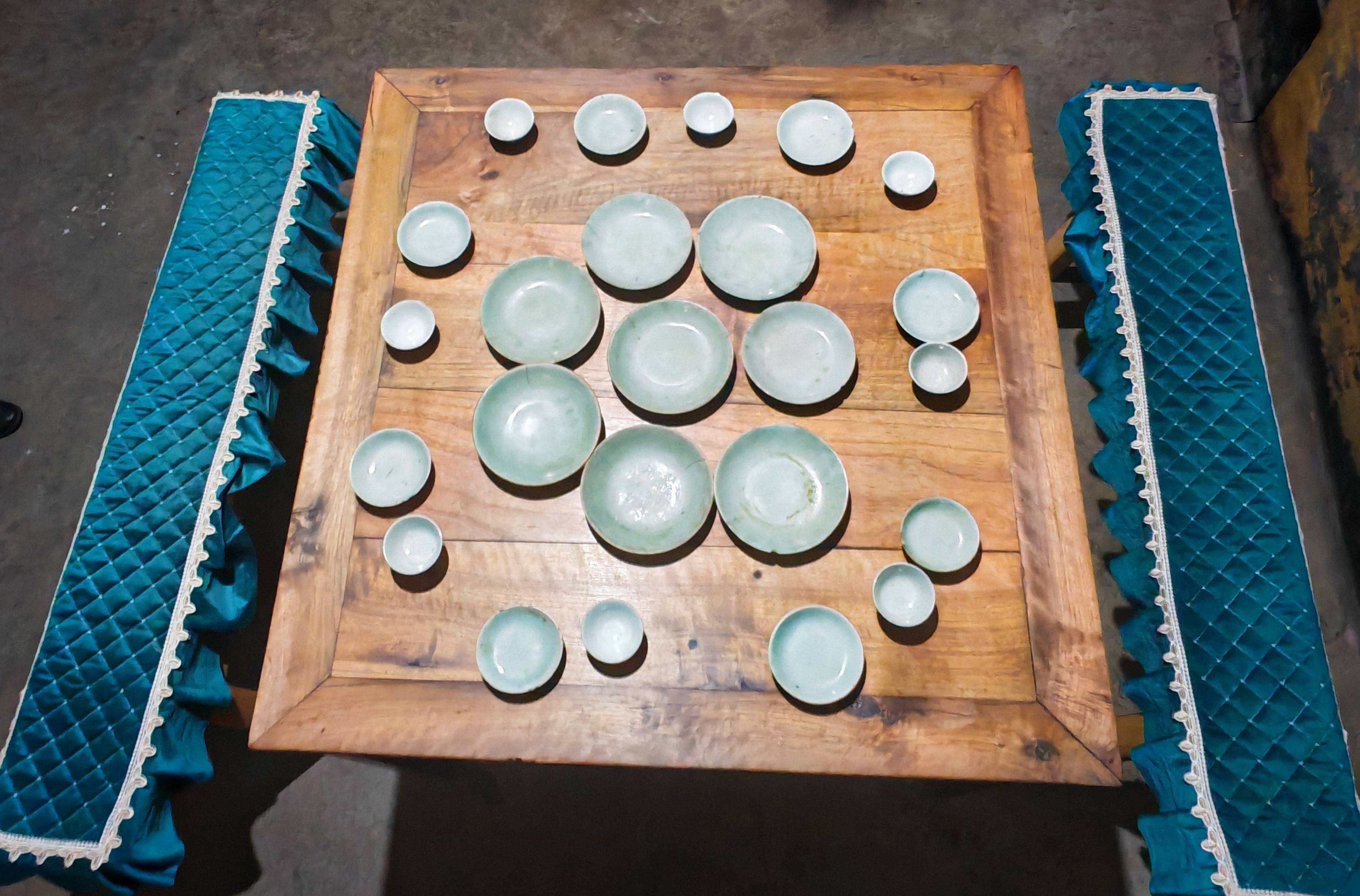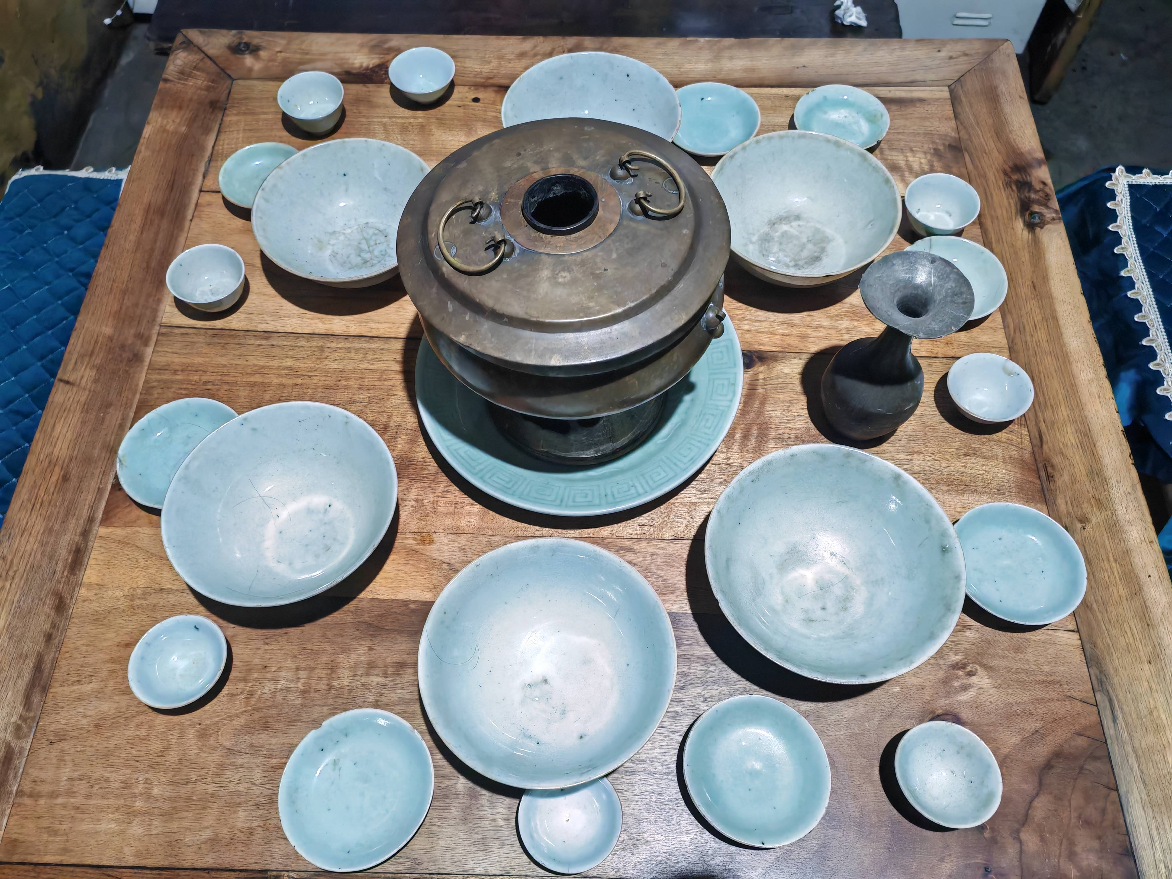 踏入老宅屋内,光线虽稍显昏暗,却恰好让一方90公分见方的黄花梨木八仙桌成为视觉焦点——桌上一组豆青色瓷器,正静静散发着清亮温润的光泽。细观这套器物,规制极为讲究:中央摆放着8只5寸碗与8只5寸碟,外围则整齐搭配着手碟(醋碟)、酒盅,还有1只锡酒壶点缀其间,从餐具配套的完整性、尺寸的协调性到颜色的统一性,都透着传统饮食礼仪的考究与精致。