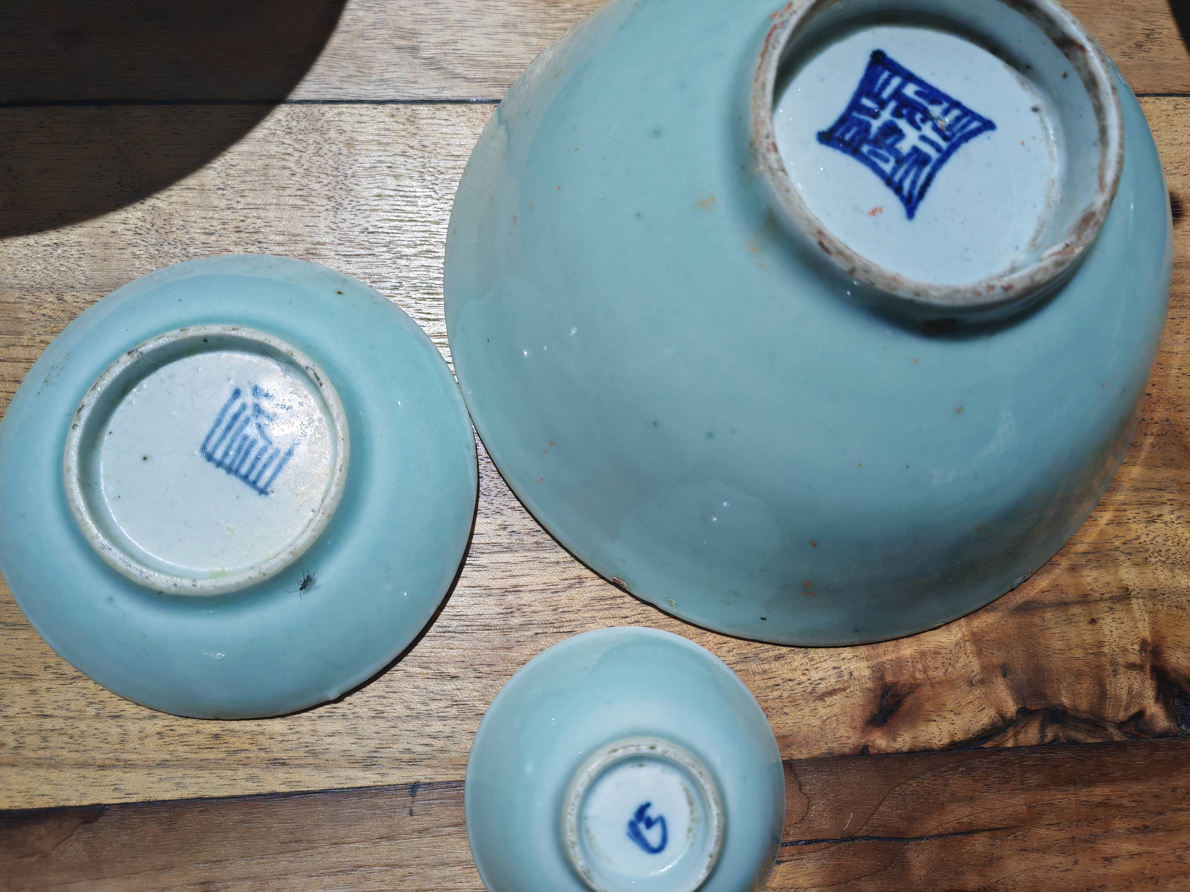 凑近端详,更能发现这些瓷器的细腻之处:釉色温润如玉,并非直白的鲜亮,而是仿佛从瓷胎深处缓缓透出微光;表面带着浅浅的裂纹与细小划痕,那是百年时光留下的独特印记,非但不显残破,反倒添了几分岁月沉淀的质感。尤为特别的是,每件瓷器的里外釉色各不相同,碗口边缘还精心饰有金边,酒盅则采用敞口带足的经典形制,线条流畅雅致;翻过瓷器底部,更能看到每一件都印有不同的年号款识,清晰印证着它们的独特身份,一器一物皆显当年工匠的精湛技艺。