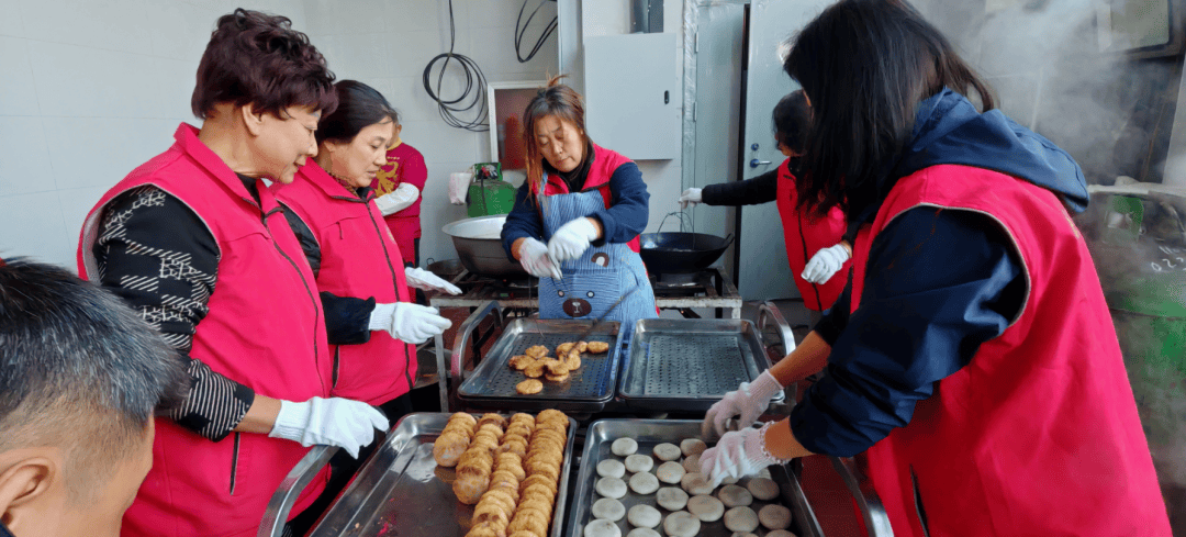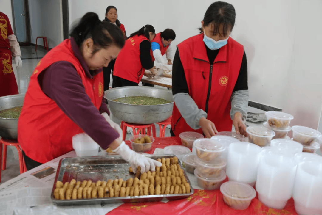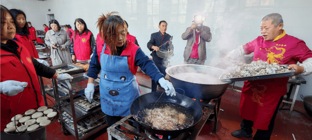 在西邵村新落成的综合文化服务中心内同样暖意流淌。一大早厨房里就飘出羊汤与炸糕的香气。餐桌旁,身着红色马甲的村民志愿者们分工协作,有的分装油糕,有的擀制面片,还有的麻利地揪着揪片——大家正为中午的敬老宴忙碌着,现场洋溢着温馨喜庆的节日氛围。