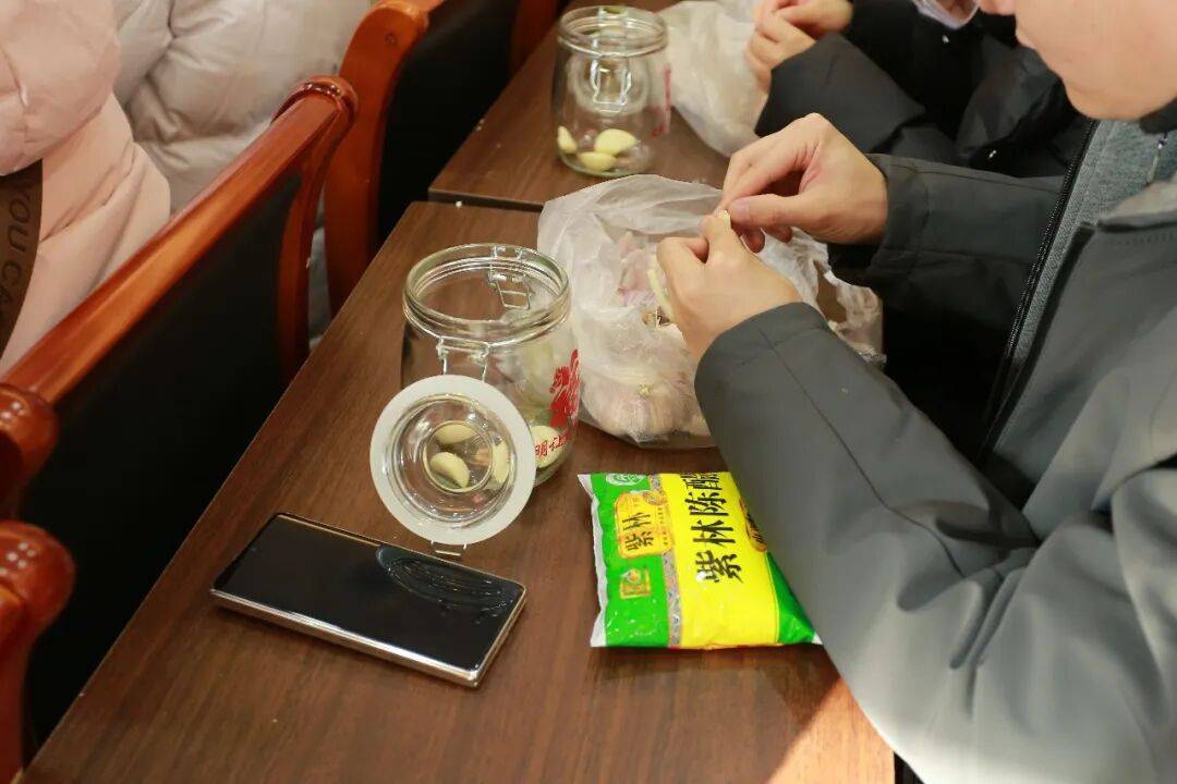 科普结束后,腌制开始,桌上是早已为大家备好新鲜的紫皮大蒜、纯正陈醋、白糖、食盐和密封玻璃罐。大家分组围坐,剥蒜、放糖、加盐、倒醋,一气呵成,拧紧瓶盖的瞬间,蒜香与醋香交织弥漫,在罐身贴上专属标签“文明让生活更美好”,记录下这个充满仪式感的时刻。