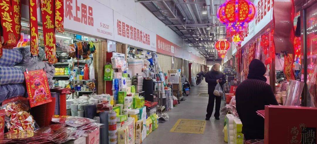 年关将近,年味渐浓。清晨的晋阳街蓝海农贸市场已是人声鼎沸。综合大厅上方,一串串红灯笼成排悬挂,连缀成片。新设的灯笼春联摊位点缀于瓜果鱼肉摊位中,更添几分红火景象。浓浓的烟火气裹着喧嚣热闹扑面而来。