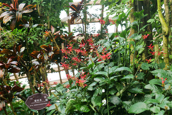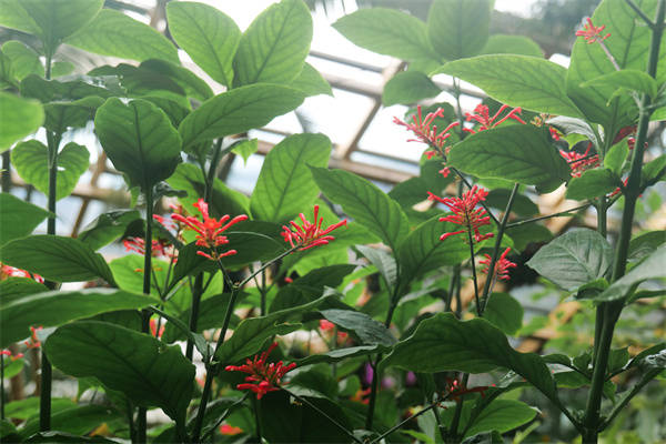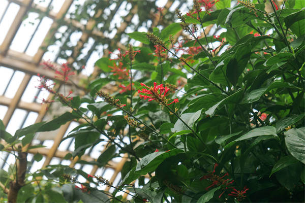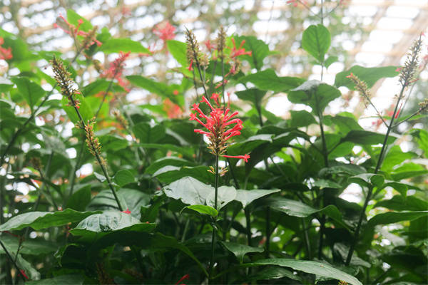 红楼花,爵床科多年生常绿小灌木,还有个别致的别名——鸡冠爵床。它株高0.5米至1.5米,不算高大却格外惹眼:膨大的茎节,对生的卵圆叶片,鲜绿有光泽,顶生的圆锥花序火红浓烈,部分花序梗顶端还会扁化成鸡冠状,也因此得名“鸡冠”。这独特的花朵就绽放在冬天,而植物园的温室恰好成为了它盛开的“庇护所”。