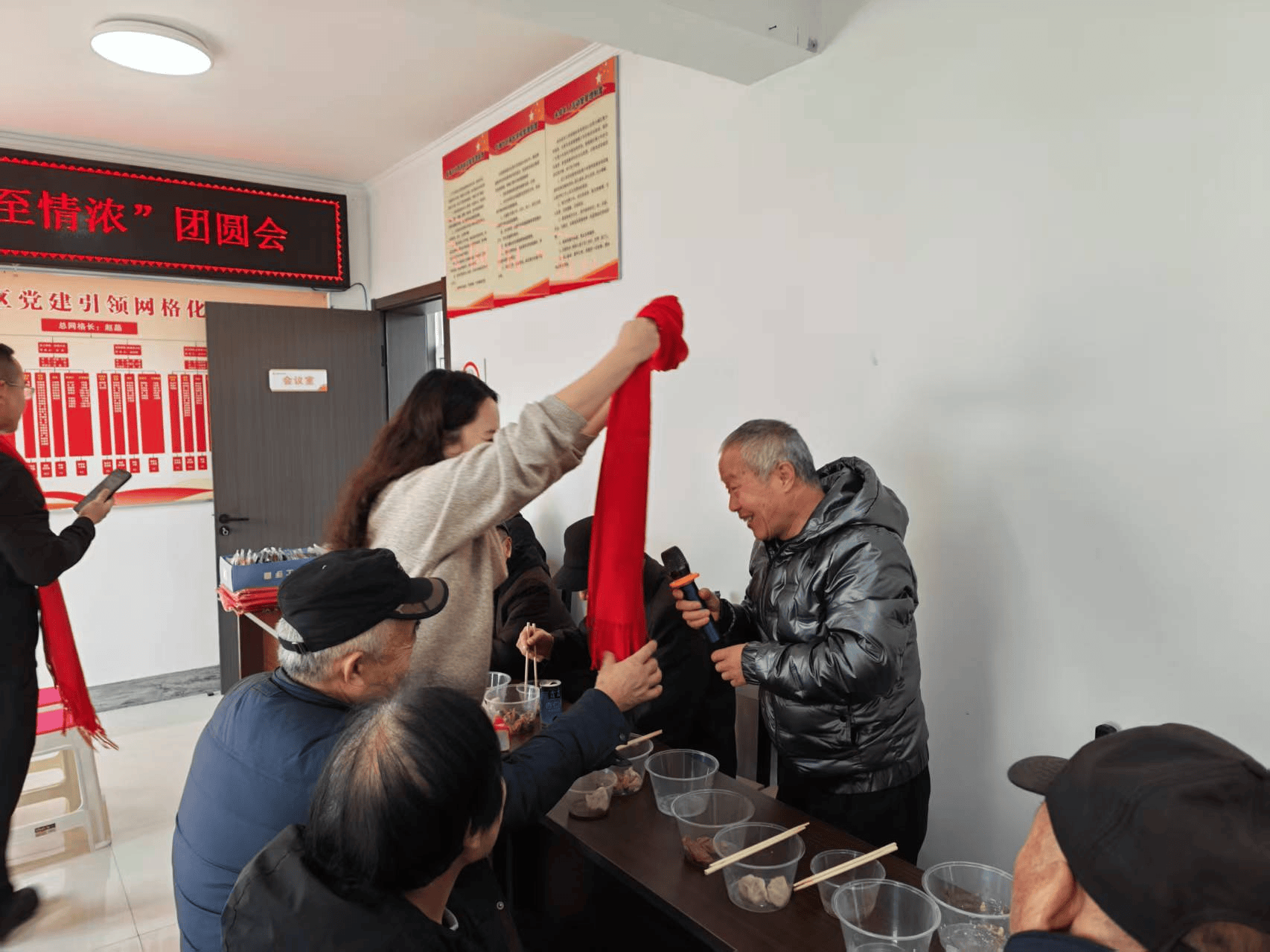席间,才艺表演环节将氛围推向高潮。老党员们轮番登台,唱响《没有共产党就没有新中国》《东方红》等经典红歌,激昂的旋律唤起共同的红色记忆;猜谜语环节更是妙趣横生,涵盖党史知识、冬至习俗、生活常识的谜题引得大家踊跃抢答,猜对谜题的老党员们喜滋滋地领取了红彤彤的围巾,暖意瞬间涌上心头。