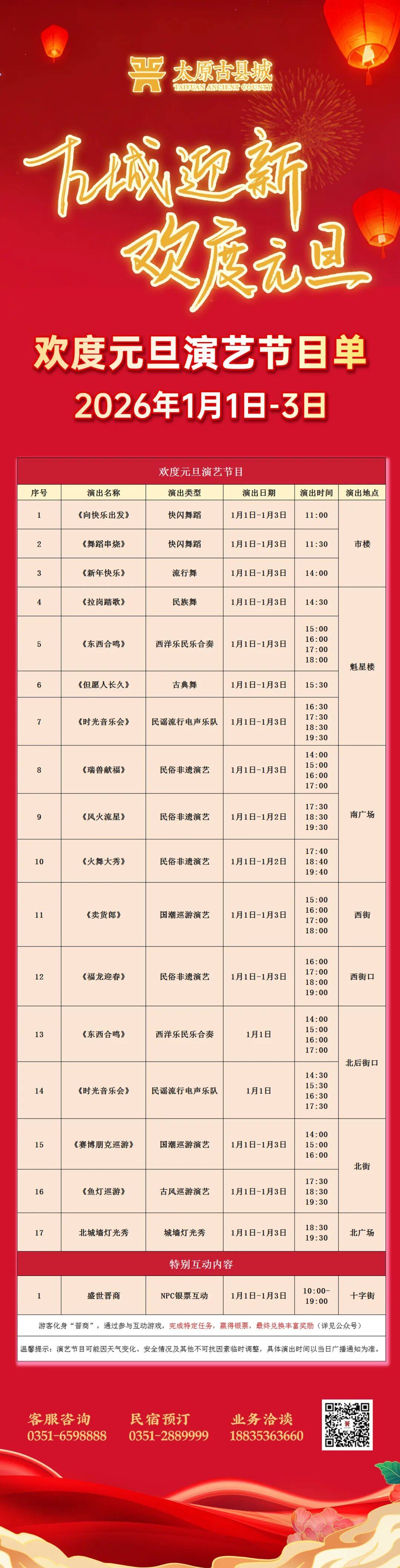 2026的钟声即将敲响,2025的最后一页,太原古县城邀您共赴迎新盛宴!2025年12月31日-2026年1月3日,“古城迎新·欢度元旦”太原古县城2026年春节预热暨欢度元旦喜迎新年活动重磅启幕,4天4夜的沉浸式狂欢,带你在古今碰撞中解锁最具仪式感的活动体验!